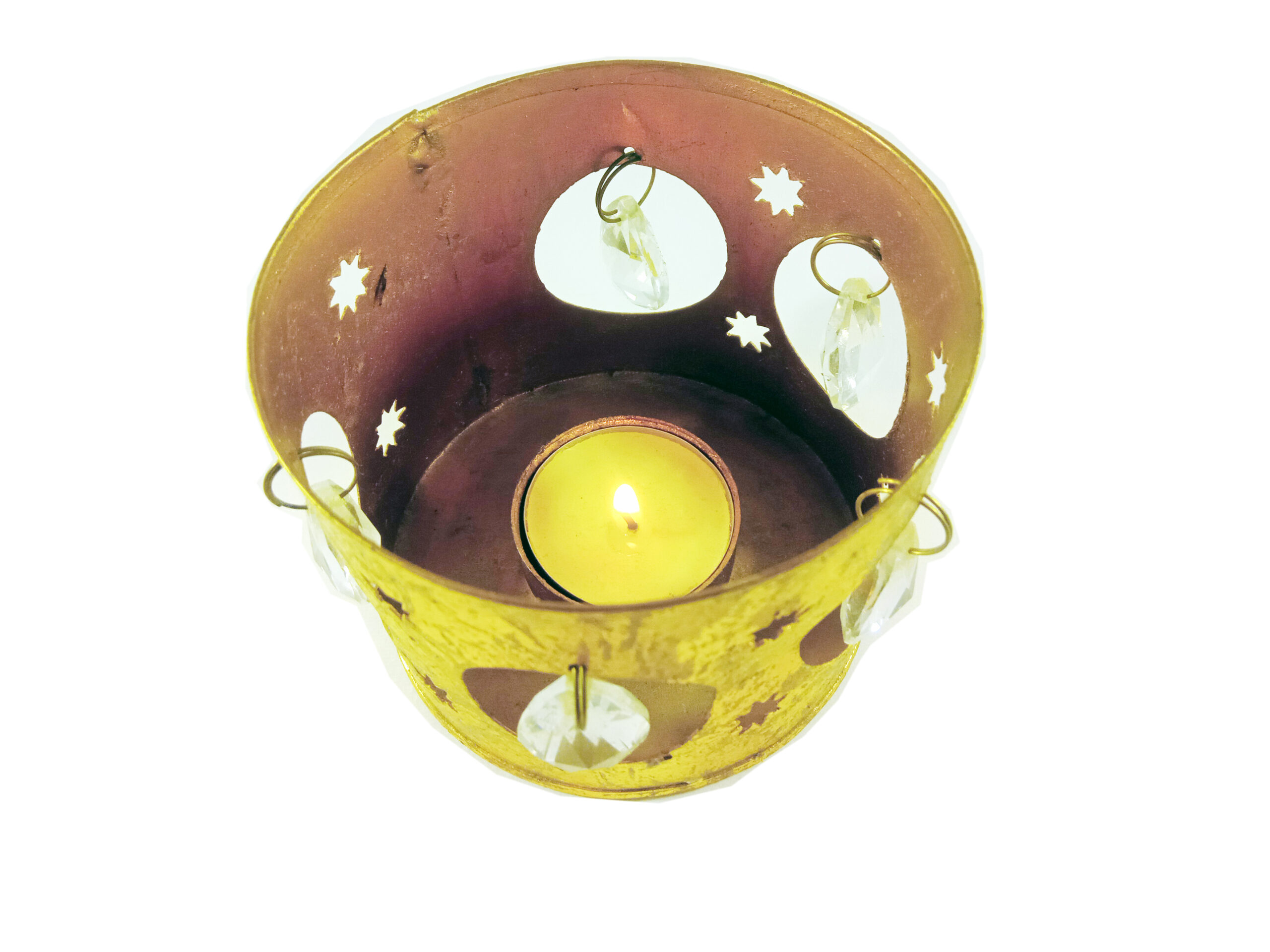 Ανατολίτικης αίσθησης κηροπήγιο με 5 μεγάλα κρύσταλλα σε σχήμα δάκρυ για να διακοσμήσετε το τραπεζάκι στο σαλόνι σας.