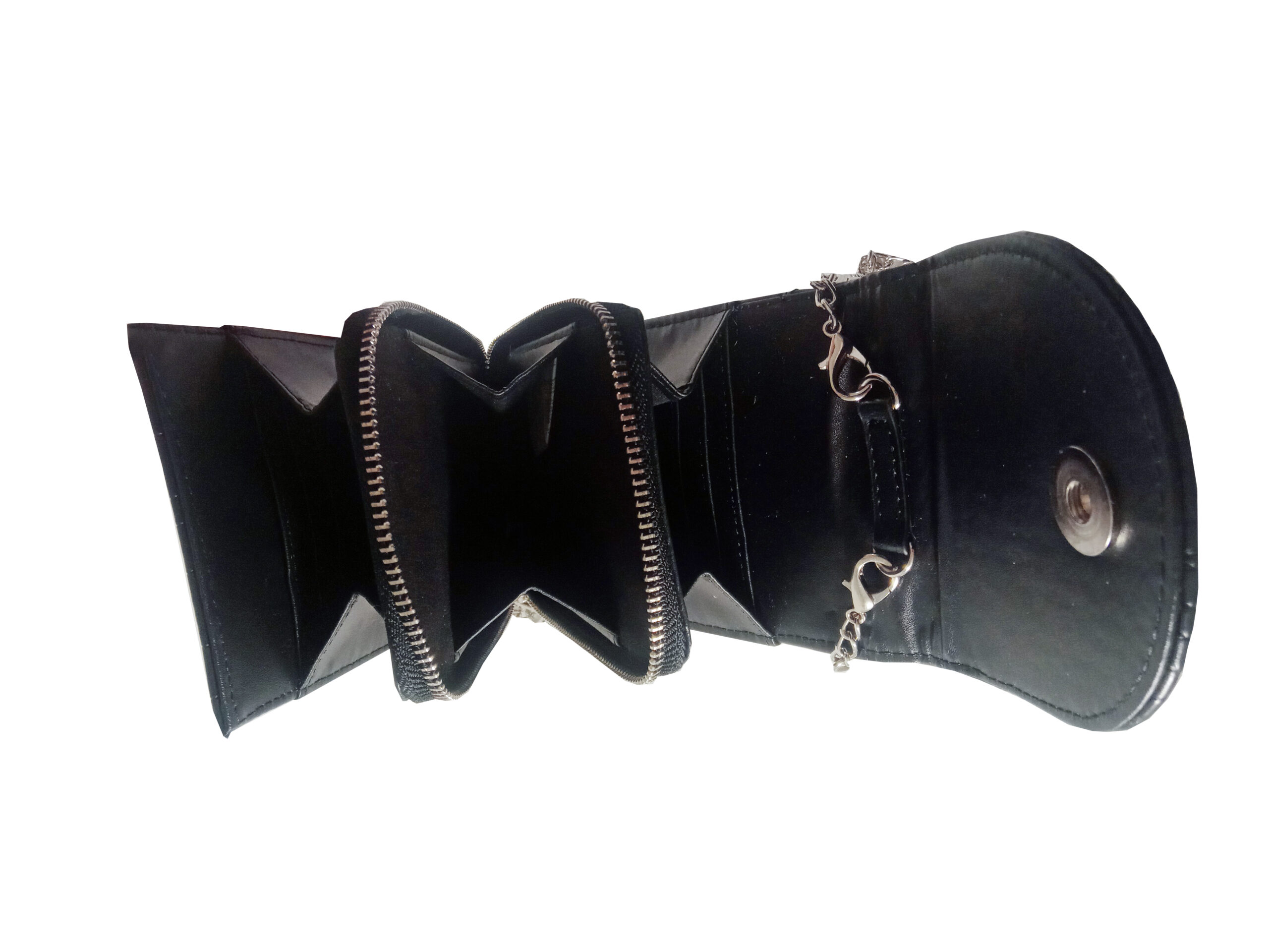 Έχει 3 θήκες, οι δύο για κάρτες και χρήματα και η τρίτη με φερμουάρ για το κινητό σας. Με ασημί αλυσίδα που αν θέλετε την αφαιρείτε.